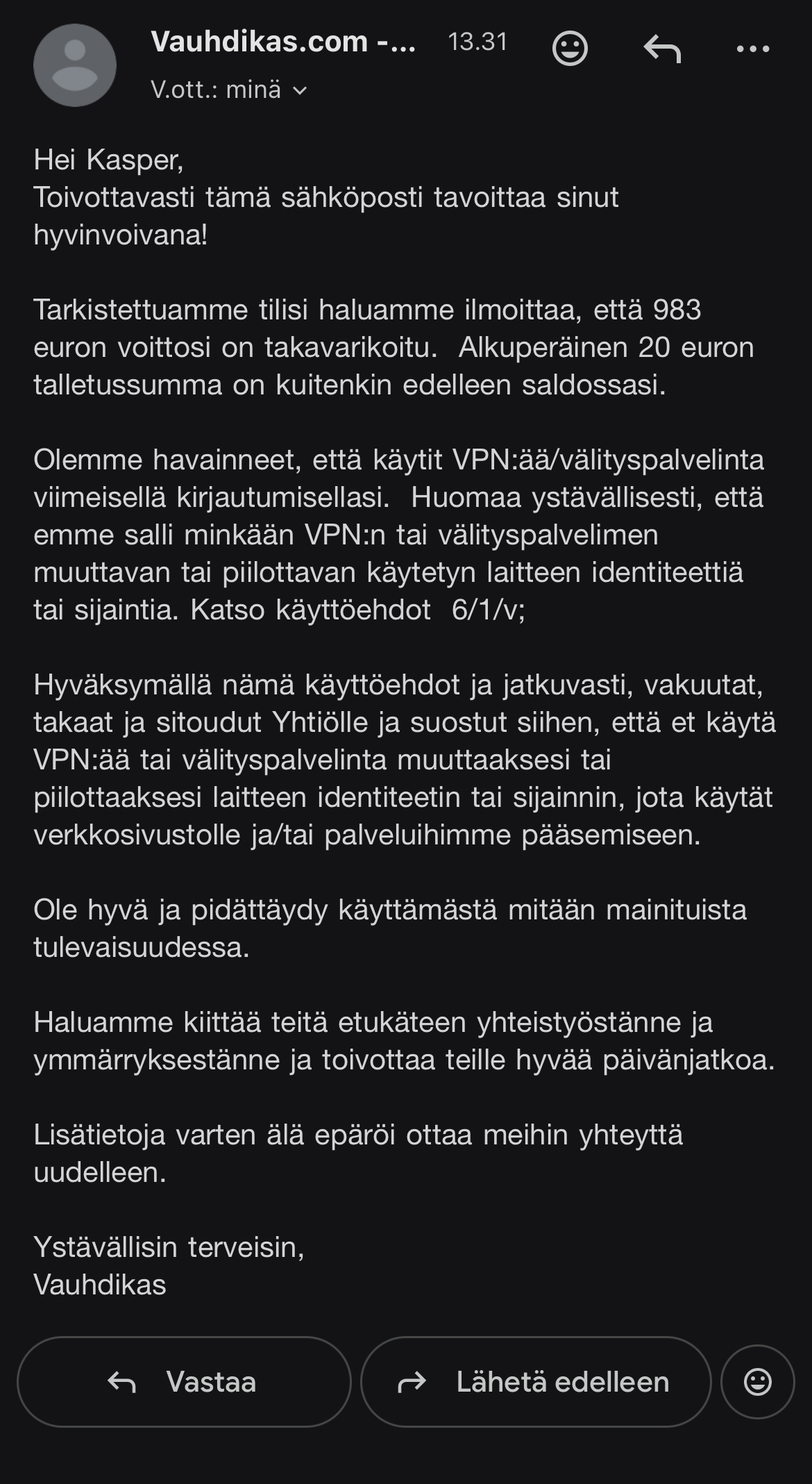 Tämä herättää vakavan epäilyn siitä, että VPN-ehtoa käytetään järjestelmällisesti tekosyynä voittojen maksamatta jättämiseen.